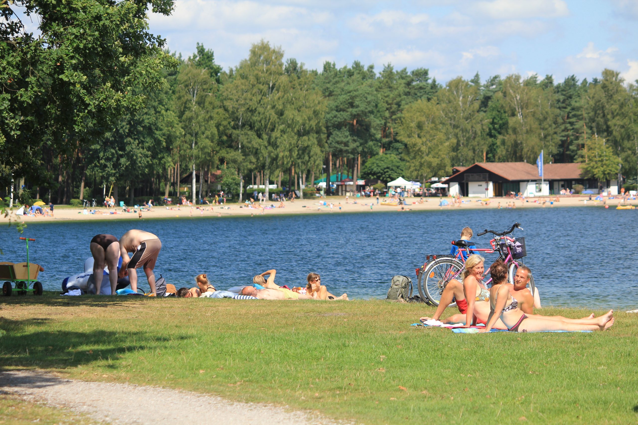 Freue Dich auf einen feinen, weißen Badestrand zum Sonnen, Buddeln und Sandburgen bauen. Der Badestrand ist in den Sommermonaten DLRG überwacht. Weiträumige Liegewiesen zum Teil mit Baumbestand laden zum Verweilen ein.
